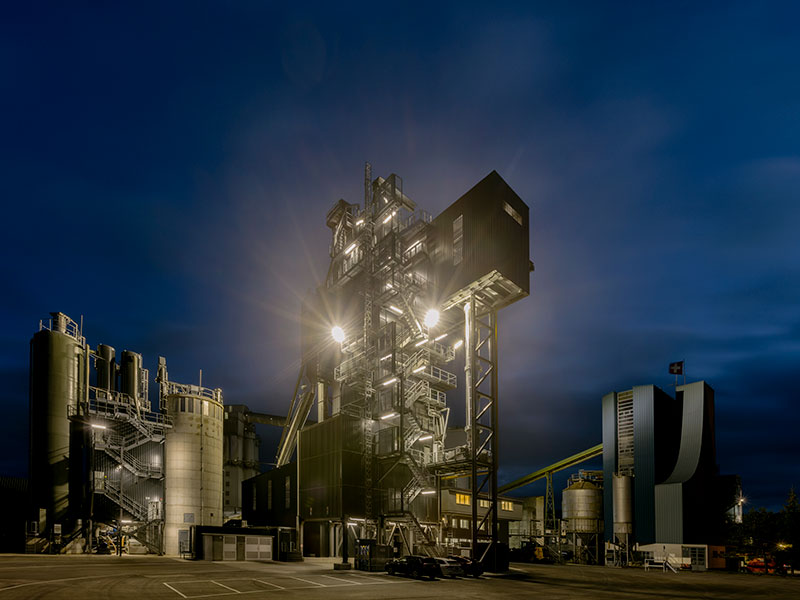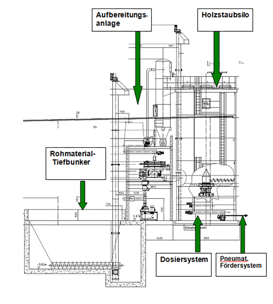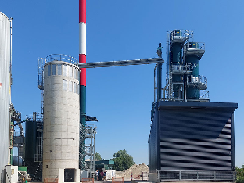 Der aufbereitete Brennstoff wird im Brennstoffsilo gelagert. Dadurch unabhängige Produktion Vorratsproduktion möglich – Befüllung des Holzmehlsilos auch bei Stillstand des Mischwerks. Somit können auch Produktionsspitzenbedarf des Mischwerks abgepuffert werden.