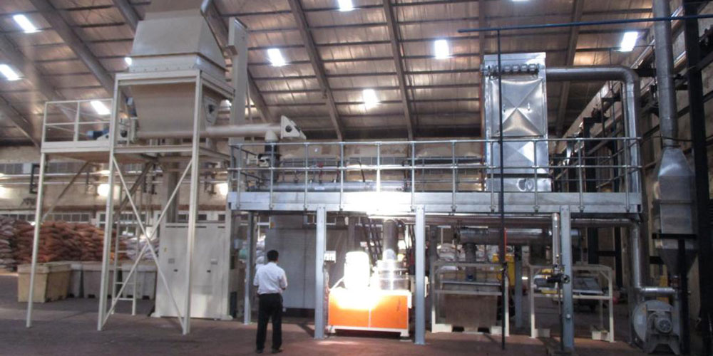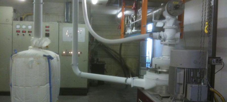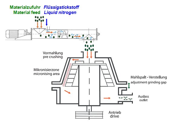 Das Material wird dosiert in die Stickstoff-Kühlschnecke gefördert. In der Kühlschnecke wird das Material im Flüssigstickstoffbad tiefgekühlt und langsam zum Einlauf der Mühle gefördert. Die Kühlschnecke ist vakuumisoliert und habe hocheffiziente schonende Mischwerkzeuge. Dies garantiert gleichmäßige Tiefkühlung des Material bei gleichzeitig minimalem Stickstoffverbrauch. Von der Cryogenschnecke gelangt das Material zur Wirbelstrommühle und wird dort mikronisiert. Da eine effiziente Mahlung der Materialien nur möglich ist so lange das Material tiefgefroren ist, kann das Mahlprinzip der UTM seine Vorteile voll entfalten: Durch eine Mischung von Prallmahleffekten und Strahlmahleffekt wird das Material in Sekundenbruchteilen extremen mechanischen Beanspruchungen ausgesetzt die das Produkt zerkleinern bevor es sich erwärmen kann. Das zerkleinerte Material wird in abgesaugt und in einem Filter vom Luft- und Stickstoffgemisch getrennt. Das immer noch kalte Mahlgas wird zurück zur Mühle geführt um den Bedarf an frischen Stickstoff zu reduzieren. Die komplette Anlage ist produktberührt in Edelstahl ausgeführt und kälteisoliert.