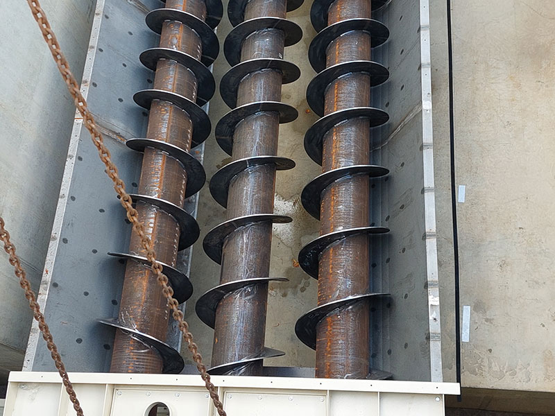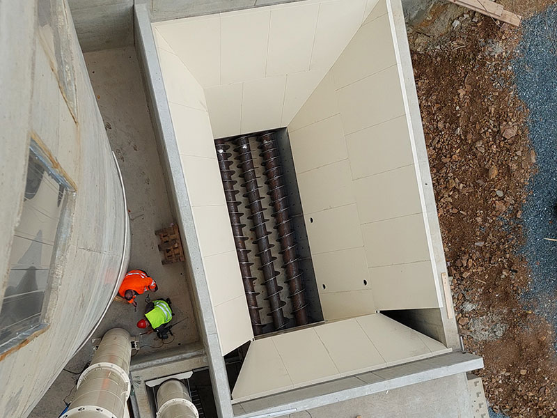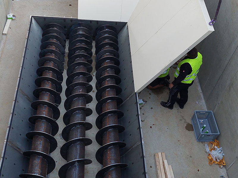 Um auch schwer fließende Materialen, die zur Brückenbildung neigen, sicher austragen zu können, bauen wir Materialsilos mit schweren Mehrfachschnecken-Austragssystemen. Anlagenbeispiel: 120 m3-Tiefbunker für Ersatzbrennstoff
