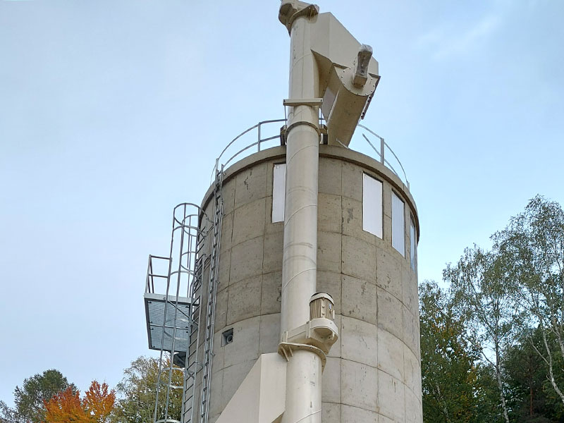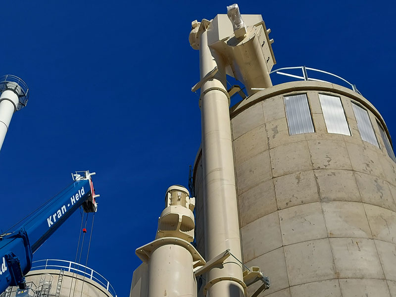 Zur Senkrechtförderung von Pulvern, Granulaten und anderen Produkten  liefern wir Senkrechtförderer mit Spiral-Förderschnecken. Mit dieser Technik können Höhen bis 20 meter bewältigt werden. Besondere Vorteile der Technik: langsamer Lauf (Unfangsgeschwindigkeit unter 1 m/sec, daher auch für Ex-gefährliche Materialien geeignet) staubarm geräuscharm unempfindlich gegen Störstoffe Montage eines 18-meter-Förderers für Holzmehl.