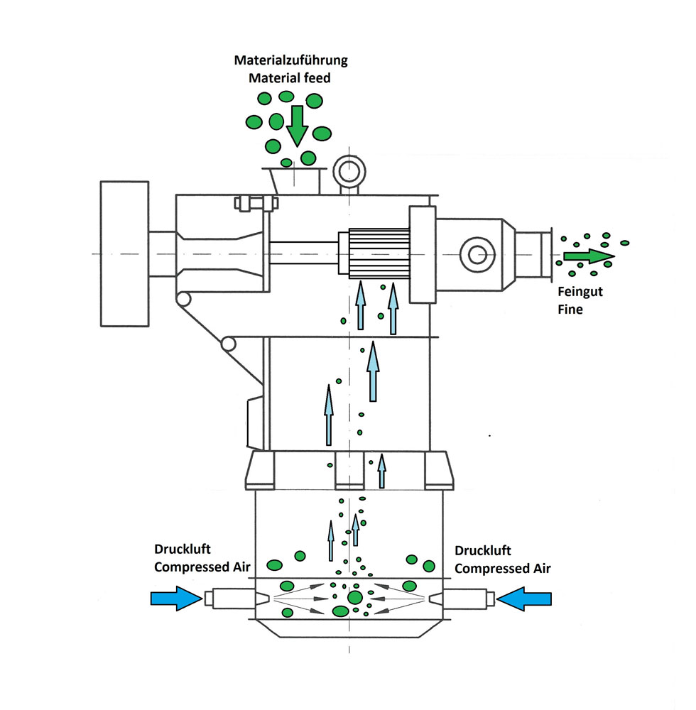 Autogene Feinmahlung durch Strahlmahleffekte, ohne mechanische Mahlwerkzeuge.